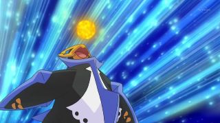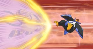 In his first battle, Empoleon starts of good, as it quickly stops Pikachu's Thunderbolt from starting with its Hydro Cannon;