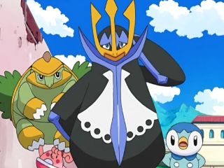 The first appearance of Empeleon is during the battle portion of a yet another failed TR plot, in which he saves Pikachu and Piplup from Seviper's Bite;