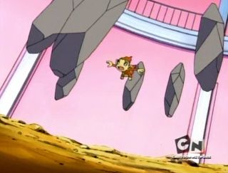 Later in the episode, Empoleon continues to Hydro Pump TR and gets hit by Meowth's Fury Swipes: